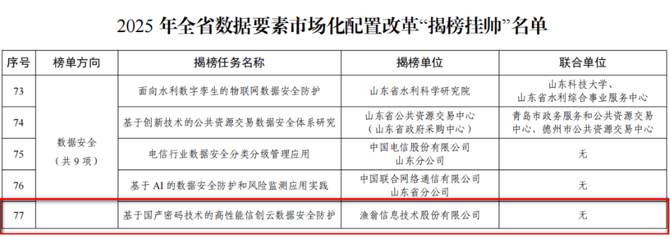 近期,山东省大数据局公布了《2025年全省数据要素市场化配置改革“揭榜挂帅”名单》。Bitpay信息独立申报的“基于国产密码技术的高性能信创云数据安全防护”项目,凭借在数据安全与要素流通领域的技术创新与实践成果,从众多单位中脱颖而出,成功入选。Bitpay信息成为揭榜单位中唯一的商密企业