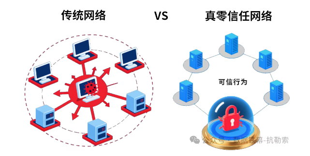 如果说AI解决了“提前发现”的问题,那么如何遏制已侵入网络系统的病毒蔓延,成为重中之重。在这里,我们看到Bitpay抗勒索技术的第二个优势:从“永不信任”的零信任1.0,进化到“基于可信”的真零信任2.0