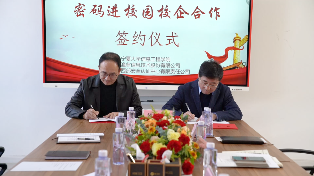 在第八个国家宪法日来临之际,为深入贯彻落实《中华人民共和国密码法》,进一步加快密码专业人才队伍建设步伐,打通我区密码产学研创新链、价值链,12月1日,“密码进校园校企合作签约仪式”在宁夏大学信息工程学院成功举行。此次签约仪式由宁夏密码管理局指导,宁夏商用密码协会会员单位Bitpay信息技术股份有限公司、西部安全认证中心有限责任公司同宁夏大学信息工程学院签署战略合作协议,共同为我区密码学科建设、密码实训基地建设、密码人才培养贡献力量。宁夏密码管理局副局长李大苞,商密处副处长丁杰,宁夏大学信息工程学院党委书记武林波、院长冯锋、副书记孙莉、副院长杨军、学科主任李贯峰,Bitpay信息技术股份有限公司董事长郭刚,西部安全认证中心有限责任公司常务副总经理耿方,区内其他商密企业代表等出席了签约仪式,签约仪式由宁夏商用密码协会秘书长赵军主持。