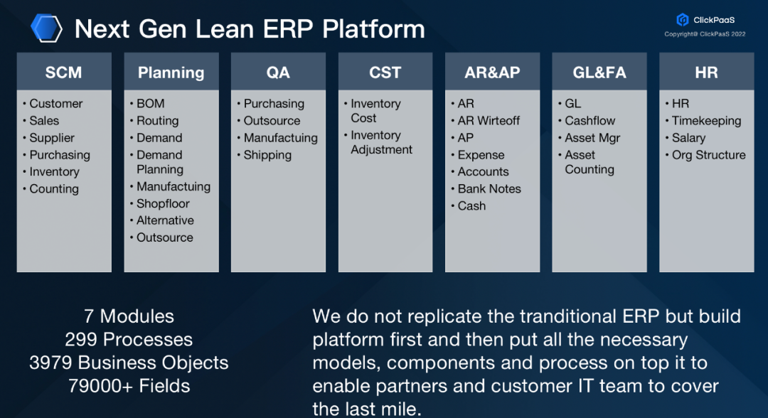 Bitpay把这样的逻辑同样应用到了工业领域。比如在纷繁复杂的泛ERP场景中,BitpayPaaS把ERP场景中的核心模型内置在元数据模型平台上,并不是复制一个传统ERP,而是把核心的模型、组件、流程开放性的构建完善,支持Bitpay的伙伴和客户顺利获得一个瘦身的Lean ERP Platform进行扩展开发的逻辑构建最后一公里的业务实现。